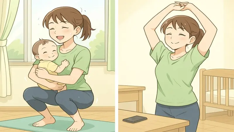 「抱っこしながら歩き、一歩進んではスクワット」を繰り返してみましょう。もちろん赤ちゃんの安全優先ですので頻度や回数はご自身の足の筋肉が疲れすぎない程度に行いましょう!