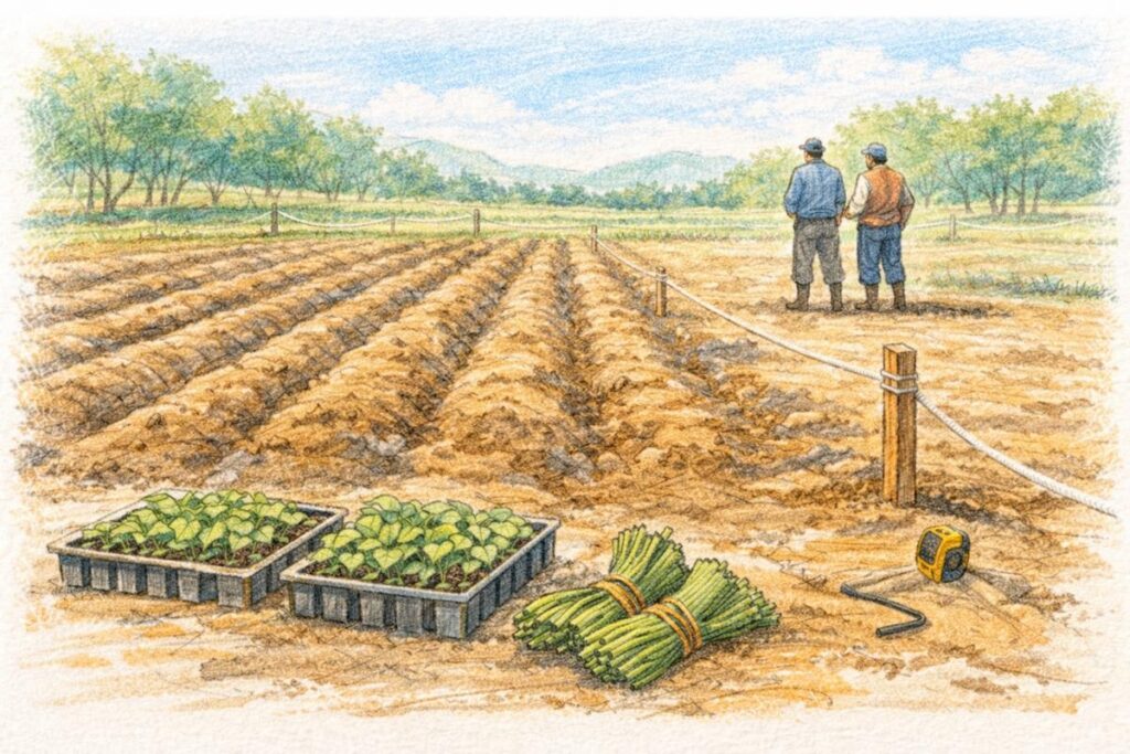 私は今回、友人とともに約700平米(200坪位)の畑を借りて、600本の苗を植えてきました。