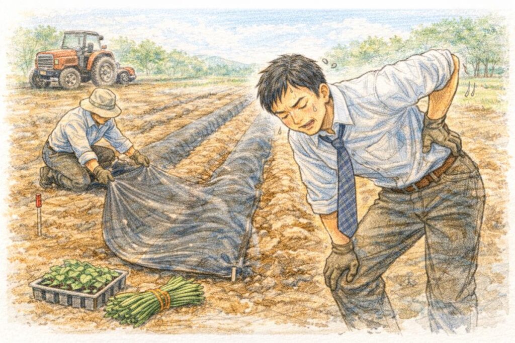 トラクターの振動が激しいですが、ゆっくり走る車で畑の全面を走行するだけなので特につらくはないと思います。