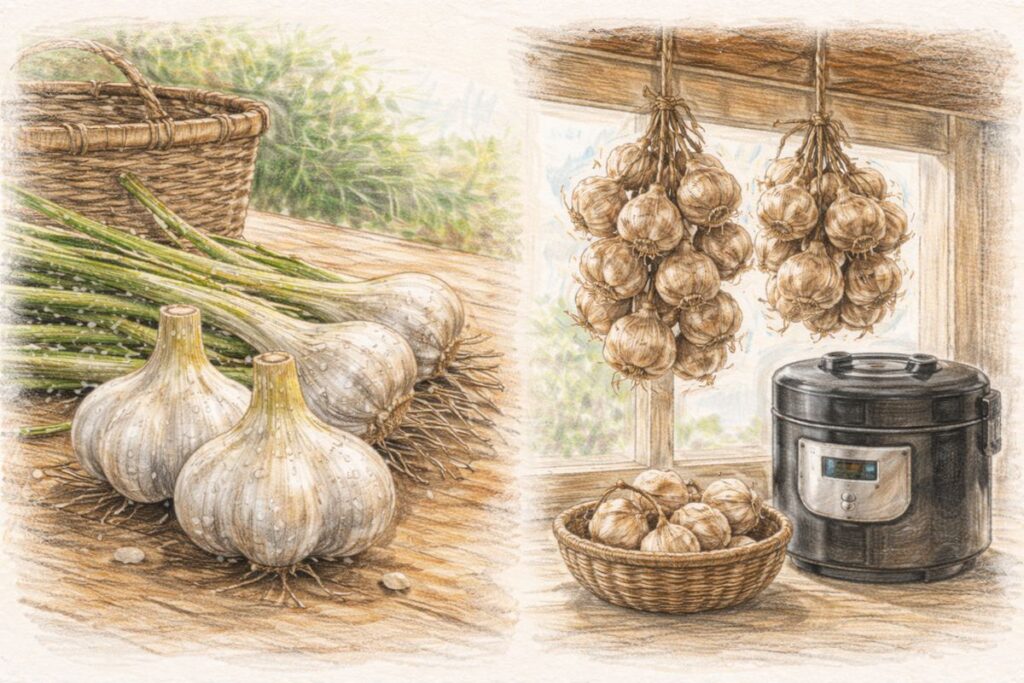 収穫直後のにんにくを黒にんにくにすると甘くなりやすい等のメリットもあるようですが、触感をべちょべちょにしたくないなら、しっかりと乾燥した後のにんにくで、黒にんにくを作りましょう。