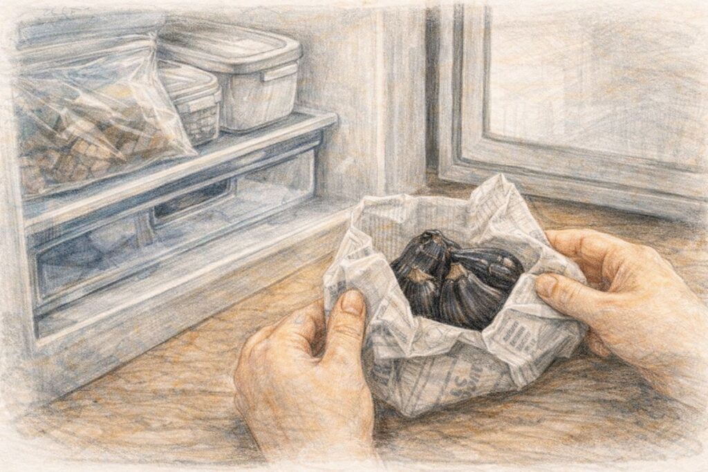 新聞紙(またはキッチンペーパー)で包んで保存する