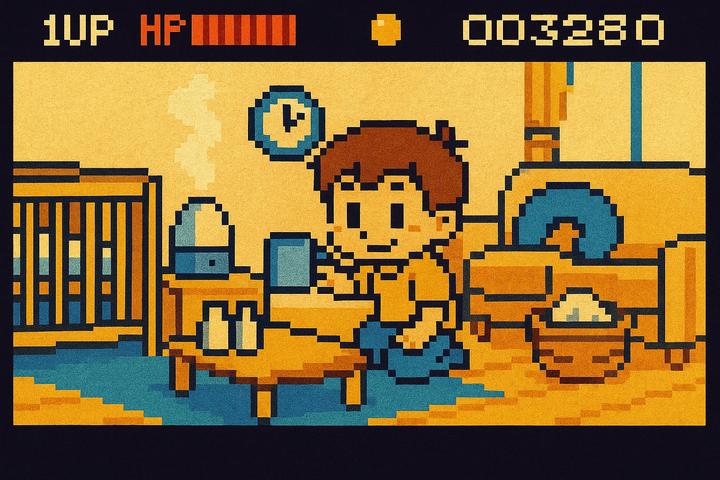 スタイルテンプレ(英語)in an 8-bit game screen UI style, pixelated graphics with a top or bottom status bar, simple HUD icons and bitmap text, classic console game feel