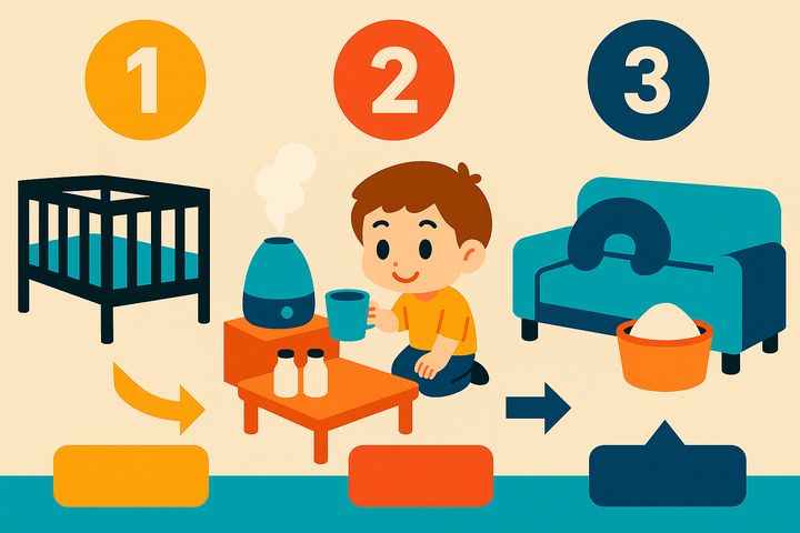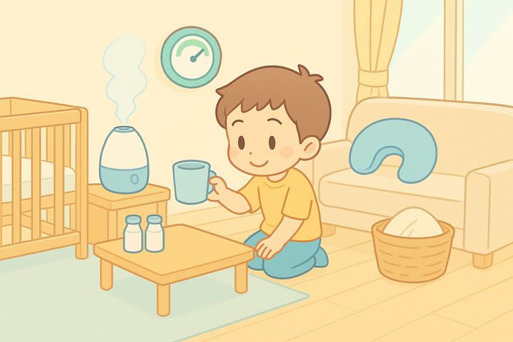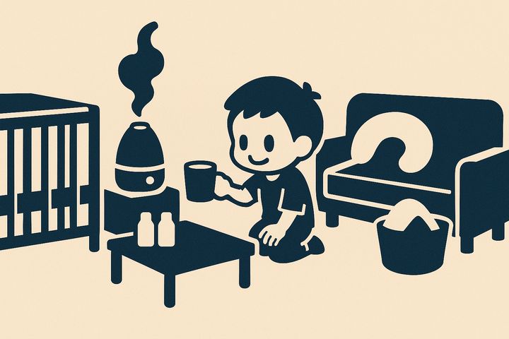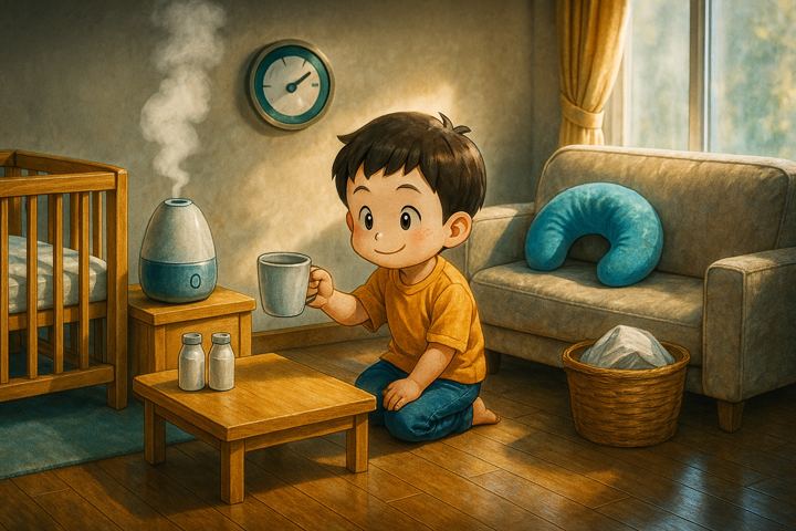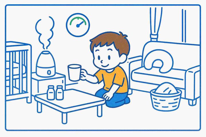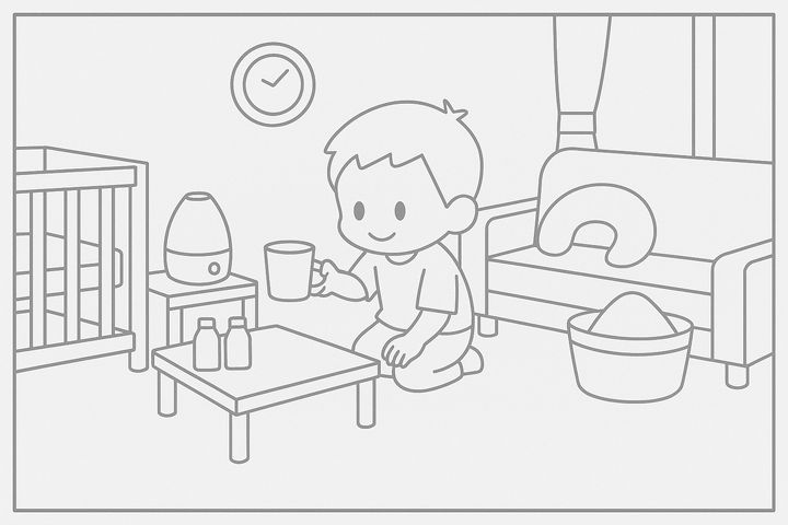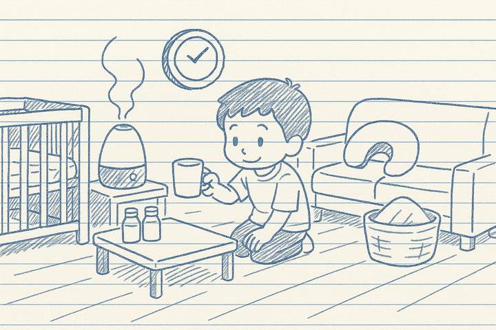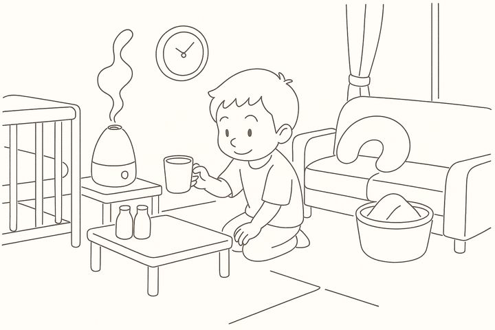スタイルテンプレ(英語)in a heartwarming family comic style, rounded characters, soft colors, simple clean lines, cozy and cheerful everyday mood