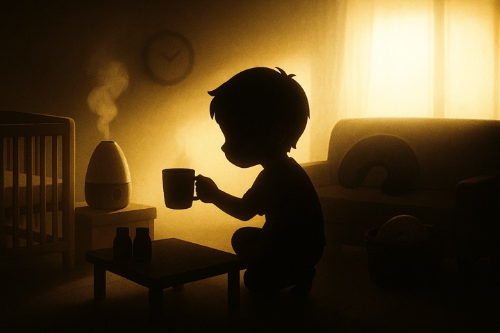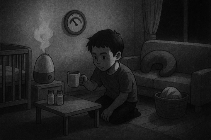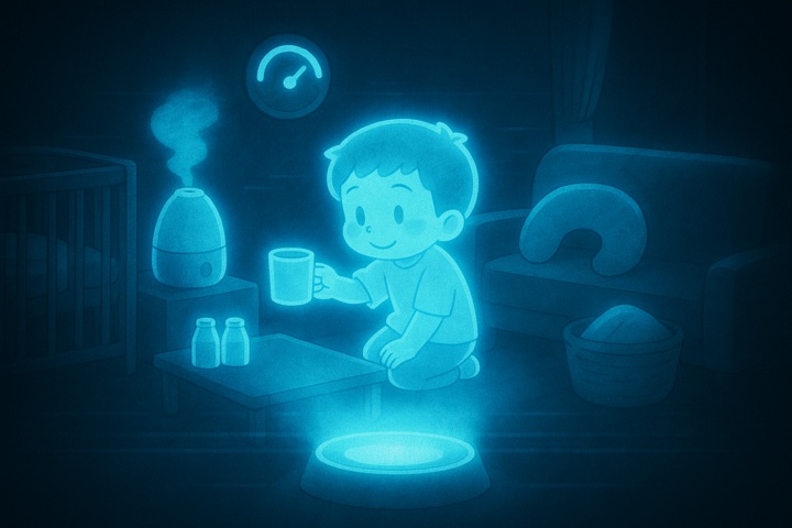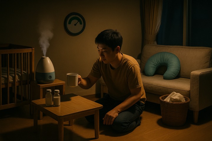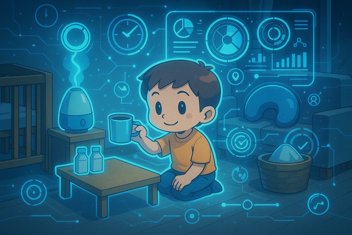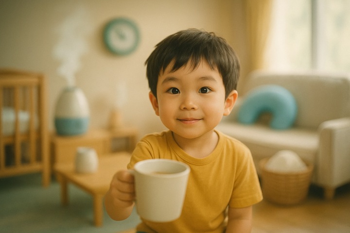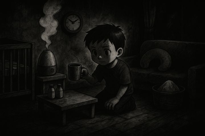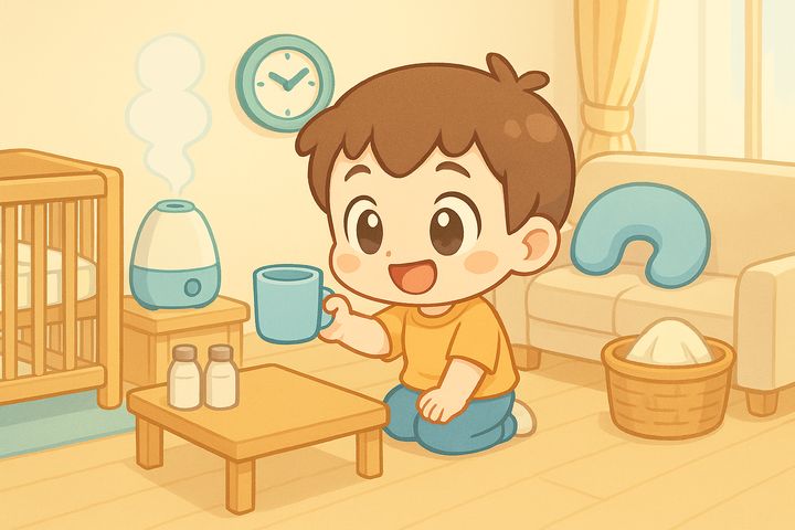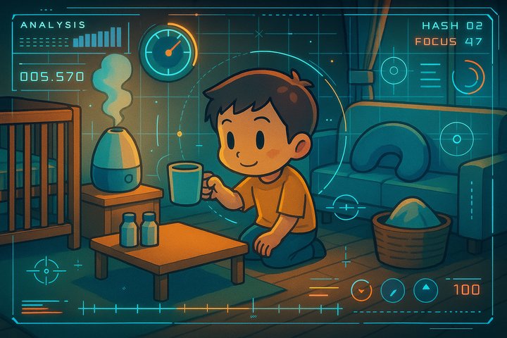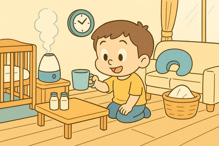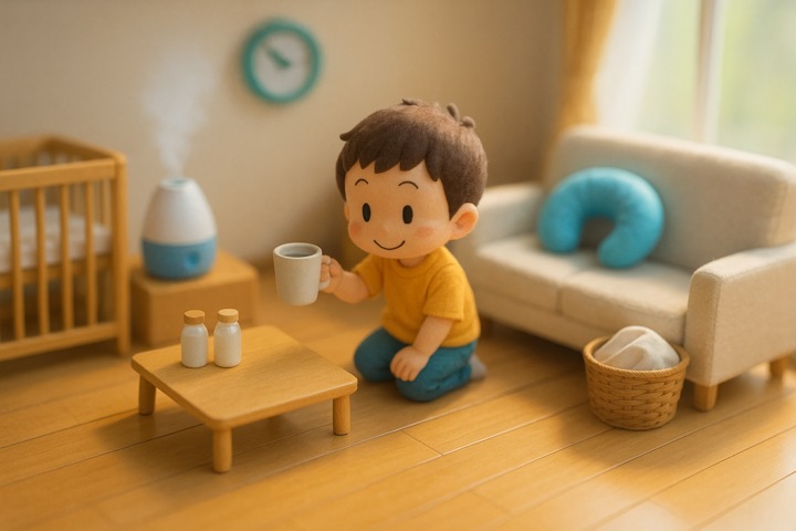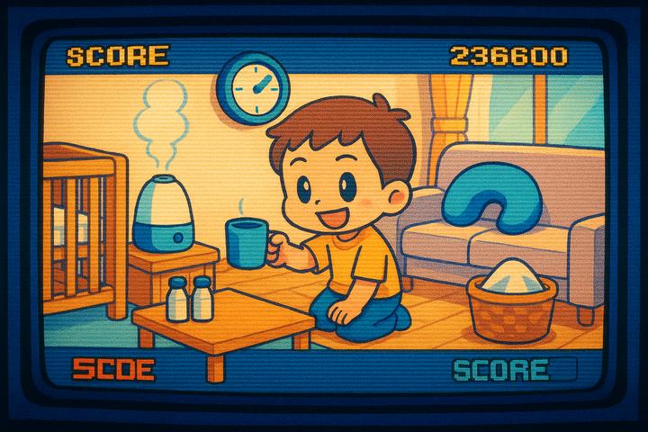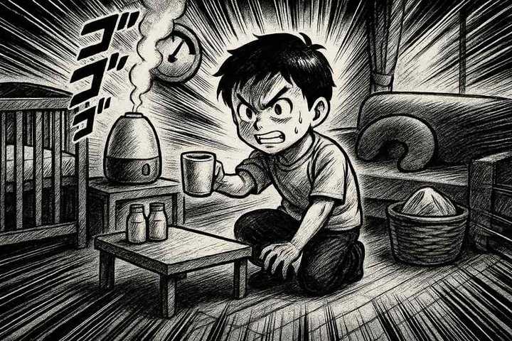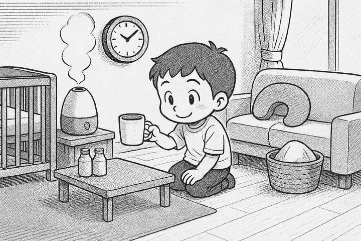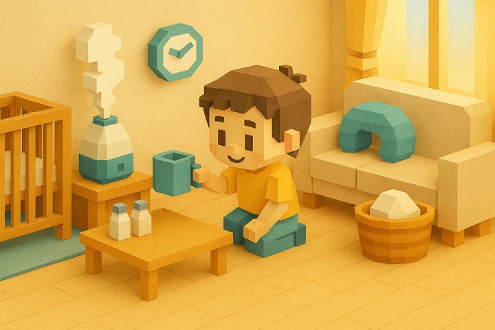 丸みのあるキャラと、やさしい色合いの日常シーン。表情はゆるくて、ちょっとドタバタしつつも家族の温かさが伝わるコミックタッチ。
