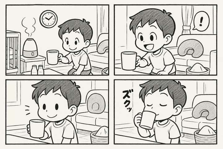 1ページを4つのコマに区切って、上から順番に進むレイアウト。シンプルな線画+フキダシが並ぶ漫画ページっぽい見た目。