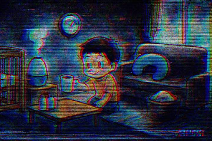 デジタルエラーが起きたような、色ズレ・ノイズ・画面の乱れが強調されたビジュアル。RGBがずれて二重に見えたり、画面が横に引き伸ばされていたりする。