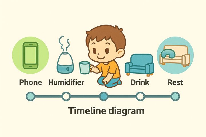 スタイルテンプレ(英語)in a timeline diagram style, a single main line with nodes and icons along it, clear steps and simple labels, structured and linear
