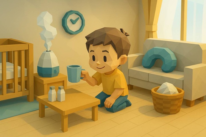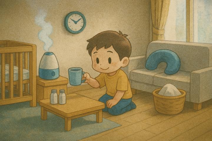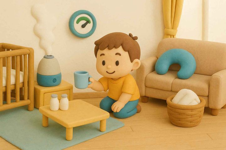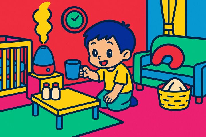 丸みのあるキャラと、やさしい色合いの日常シーン。表情はゆるくて、ちょっとドタバタしつつも家族の温かさが伝わるコミックタッチ。
