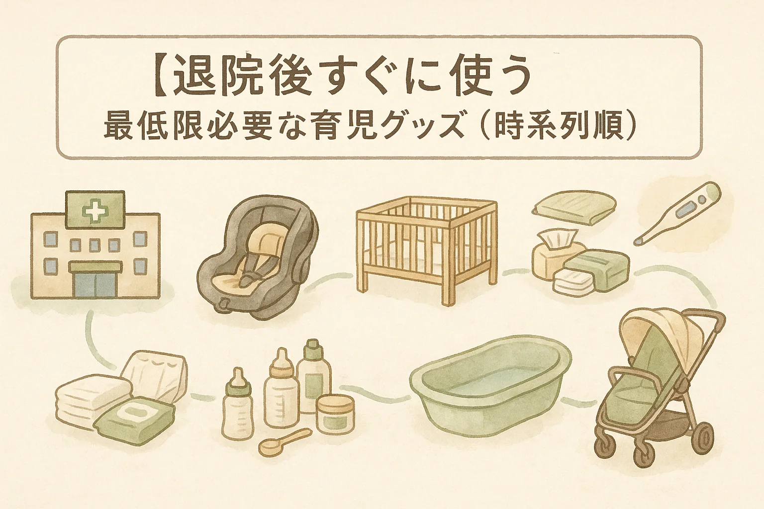 この記事では、退院当日→帰宅直後→その日の夜→その後の生活の流れに沿って、最低限必要な育児グッズと必要なタイミングを紹介しています。