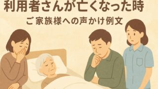 介護 【看取りケア】ご家族への声かけ例文集とNG例|介護施設向け 利用者さんが亡くなった直後のご家族への声かけに悩む施設介護士へ。看取り期のご家族対応にもう迷わない。介護現場で使える声かけ例文をパターン別に紹介。声かけの一言フレーズ集&NG例もまとめました。 2025.10.02 介護
